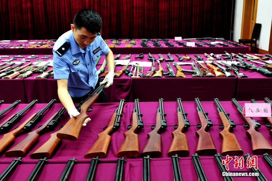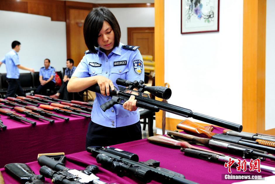 5月22日,公安人员在广东省公安厅检查汕头公安“504”行动中缴获的138支具备枪支性能的气步枪。截止5月20日,广东省共破涉枪案件338宗,收缴枪支845支,子弹11093发,炸药7739.3公斤,仿真枪31.6万支并抓获网上涉枪逃犯232名。中新社发 陈骥旻 摄