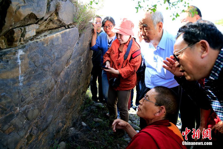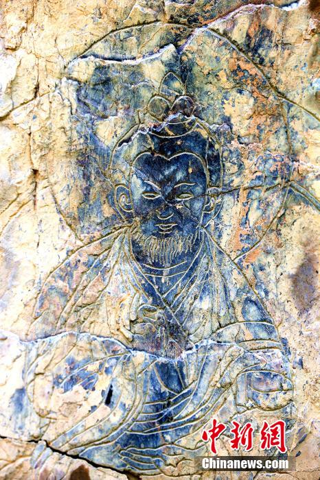 5月19至22日,中国著名佛教考古专家温玉成教授、中央民族大学著名西藏岩画专家张亚莎教授一行,对四川金川县勒乌乡境内发现的摩崖线刻进行了现场考古调查。经现场调查共发现9组线刻图像,除了有缜密的密宗造像,另在大小不一的修行洞附近,还发现造型各异的神像、僧侣造像。据悉,系11世纪到12世纪之间的苯教摩崖线刻群,是目前发现的苯教图像规模最大的早期摩崖线刻群,是苯教考古的一次重大发现。图为摩崖上发现的线刻图案。中新社发 根秋多吉 摄
