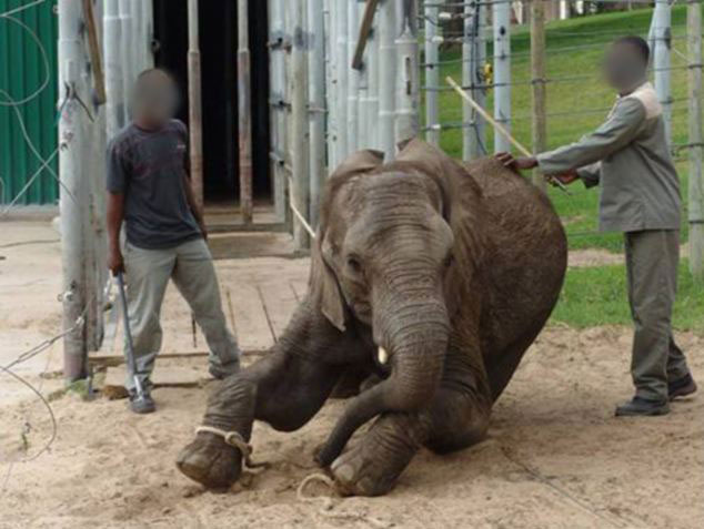 据英国《每日邮报》5月21日报道,南非东开普省的一家野生象园在对大象进行训练时,手段残忍,又是电击又是鞭打,还用链子与绳索将小象捆绑起来。爱护动物协会(SPCA)在该园拍下训练员使用残忍手段迫使动物臣服的视频引起关注。