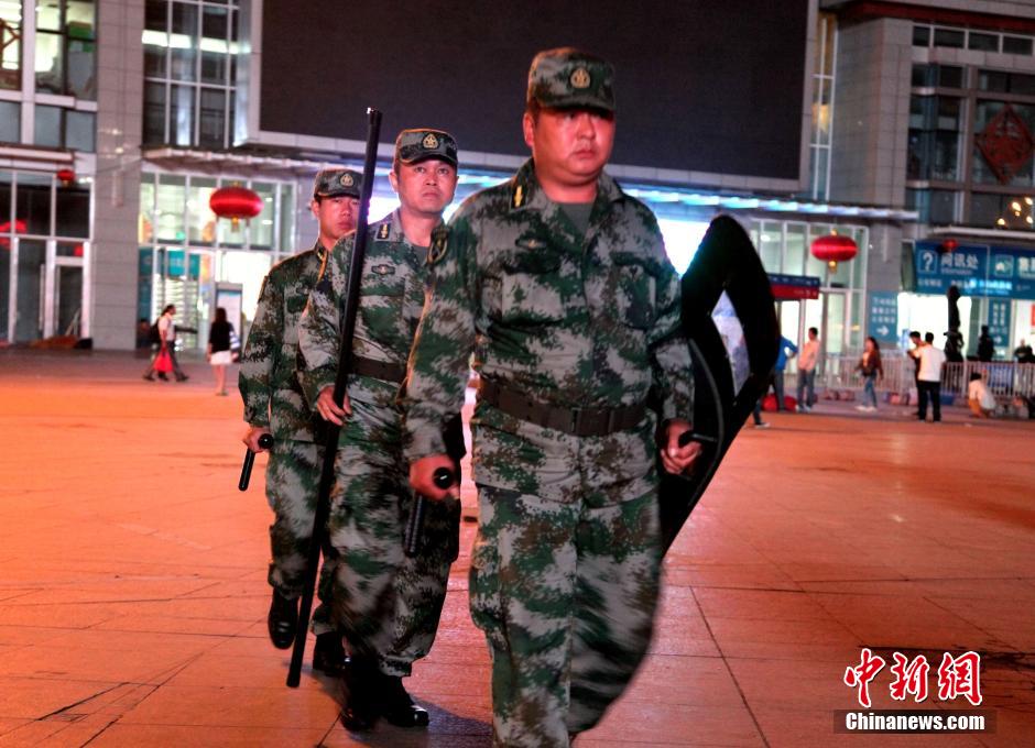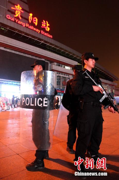 贵州警方从22日起联合军方进行武装巡逻,增派力量进行治安卡口查缉,对枪支弹药、危爆物品、管制刀具、散装汽油等重点物品严加监管。针对火车站、机场、汽车站、学校、公交车站台等人员密集区,警方将进行全天候、不间断的武装巡逻和武装查缉行动,一旦发现暴力恐怖行为或是暴力恐怖分子拒捕抗法,警方会依法使用武器警械进行制服。2014年5月22日晚十一点,贵阳警方配齐配强长、短武器和必要的警戒及防护装备、通信器材等,加强对火车站等重点区域武装巡逻,确保贵阳治安稳定,保障旅客安全出行。杨茜 摄