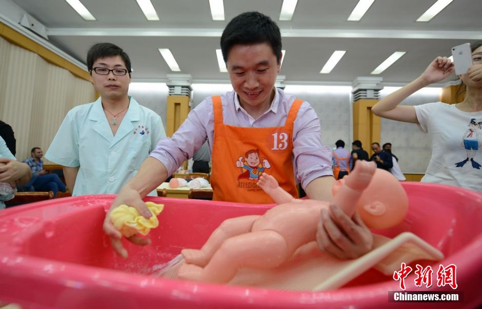 5月23日,湖南省儿童医院首季“超级奶爸”训练营正式开训,40名“菜鸟”奶爸现场囧态百出。据了解,此次训练营是由湖南省儿童医院新生儿专家团队全程免费教学,为奶爸们重点培训婴幼儿的抱姿、喂奶、换尿片、挑选生活用品等吃、穿、住、行、医五个方面20余项育儿理论与操作技能。 杨华峰 摄