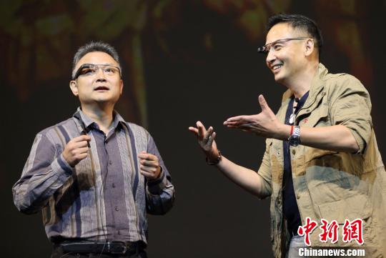 87版电视剧《红楼梦》中贾宝玉的扮演者欧阳奋强(左)和北静王的扮演者侯长荣(右)戴着谷歌眼镜和跨超本《红楼梦》与观众见面。 泱波 摄
