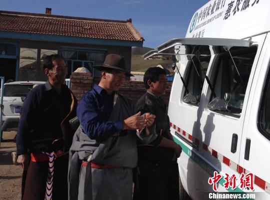 在海拔3200米的甘南州合作市,牧民南卡桑吉等人在自家门前,通过“流动银行”惠农服务车办理存取款业务。张小菊 摄