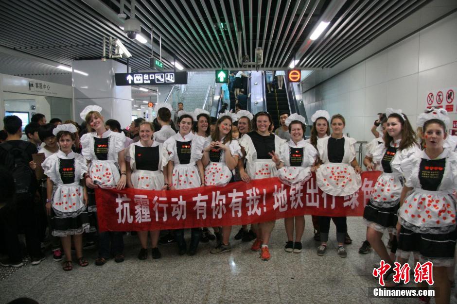 5月25日,一群女仆装扮的外籍美女在长沙街头和地铁站玩起“快闪”,并向路人派发抗霾知识传单及抗霾口罩。她们的“快闪”抗霾活动,引来众多市民围观,收到不少市民点“赞”。王柳汀 摄