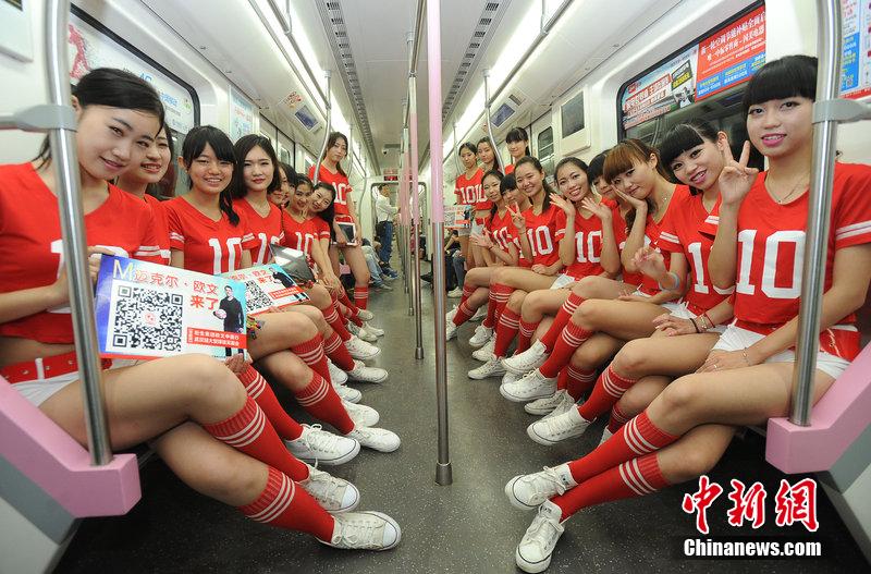 2014年5月25日上午10时许,武汉,世界杯已进入倒计时,20位美丽天使身着10号“欧文”球服,化身足球宝贝,从地铁2号线金银潭站上车至光谷广场站,延线即兴表演,大秀热舞,吸引了大量乘客目光,纷纷上前与宝贝们合影留恋。