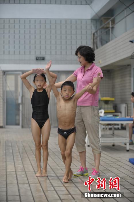 24日下午,“跳水女皇”高敏在清华大学跳水馆辅导“于芬基金”资助下的孤儿训练。图为高敏给两名藏族孤儿满珠(左)和曲批讲解动作要领。李杰 摄