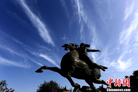 图为“穿越时空”雕塑在蓝天的映衬下更加壮观。杨正华 摄