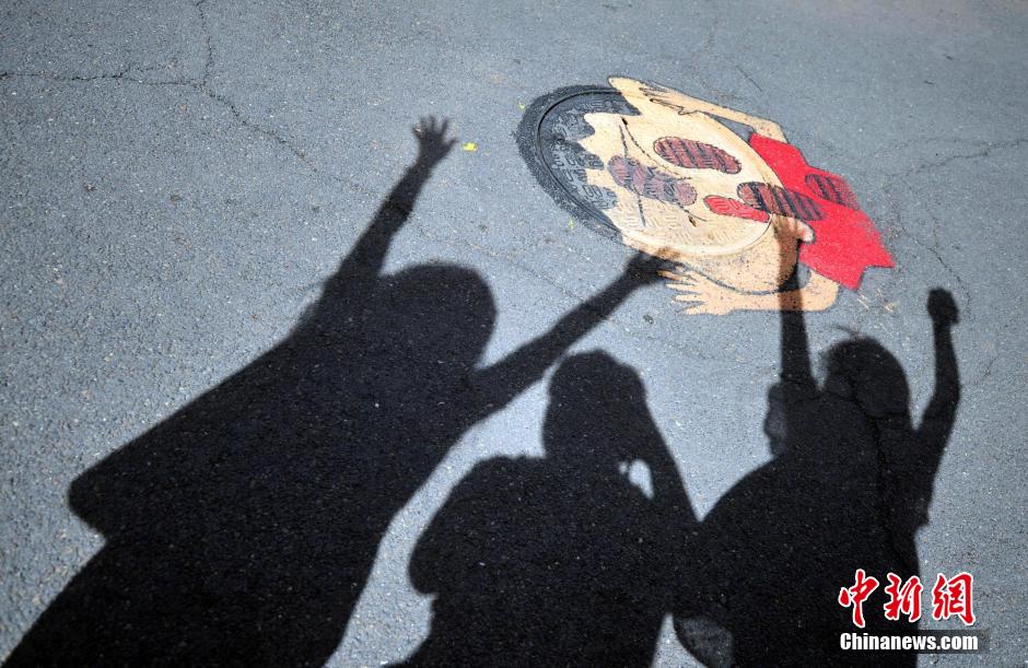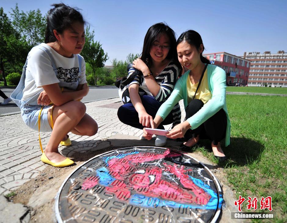 5月26日,几名学生的身影与沈阳师范大学校园内地面上的“卖萌”井盖相映成趣。据了解,这是该校“井盖涂鸦设计大赛”活动的作品,此次活动旨在丰富同学们的课余生活,美化校园环境。美丽的图画让不少过路学生不忍踩踏,能一定程度上预防危险发生。中新社发 于海洋 摄