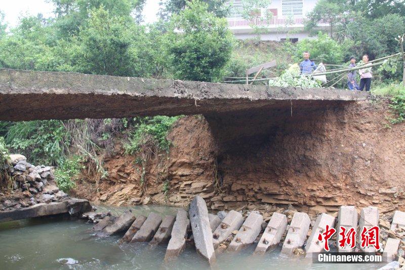 5月26日,江西省宜春市袁州区西村镇圳江村一段长约10米的水泥路被山洪冲毁路基,只剩路面悬在约3米高的空中未垮塌,被路人称为“路坚强”。邹海斌 摄