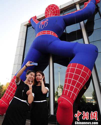 5月26日,沈阳市民在街头与巨型“蜘蛛侠”合影。当天,一个高10余米的巨型“蜘蛛侠”造型现身沈阳街头,吸引众多市民围观,纷纷拿起手机拍照留念。中新社发 于海洋 摄
