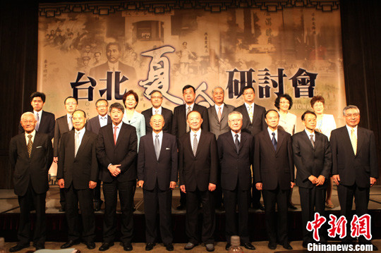 5月26日,方夏文化交流协会与台湾“两岸统合学会”共同主办的“台北·夏合研讨会”在台北举行,近30位两岸退休涉外人员和学者与会。本次会议以“两岸看甲午”为主题,包括“两岸关系与亚太稳定”等3个分议题。图为两岸与会嘉宾合影。中新社发 陈小愿 摄