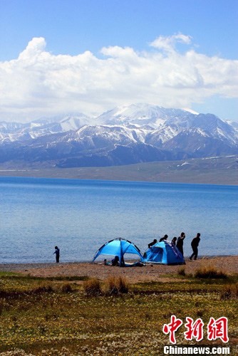 新疆维吾尔自治区博尔塔拉蒙古自治州境内的赛里木湖畔,迎来最美旅游季节,圣洁的雪山,湛蓝的湖水,烂漫的山花构成一幅绝美的天然画卷。中新社发 汪铁锁 摄