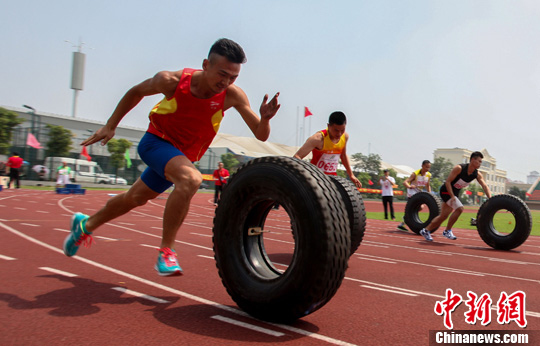 5月27日,全国农民健身活动在上海举行,本次农民健身活动共设100米推轮胎跑、3人4足跑、50米收谷赛、80米担运粮食赛、拔河等7项赛事,吸引了来自全国24个乡镇运动队的266名农村体育健儿共同参加角逐。中新社发 张亨伟 摄