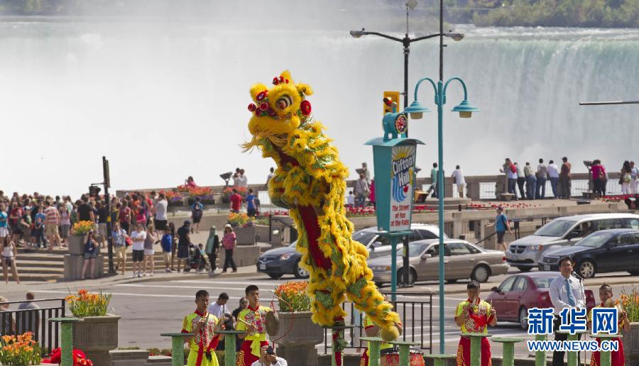 5月26日,在尼亚加拉瀑布景区加拿大一侧,来自中国佛山市南海黄飞鸿中联武术龙狮协会的表演者在进行舞狮表演。