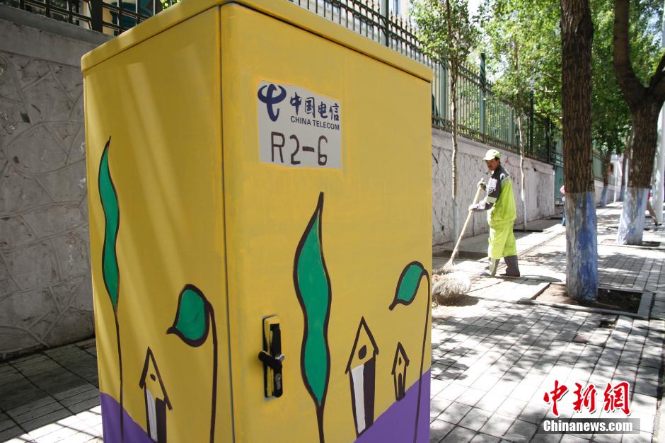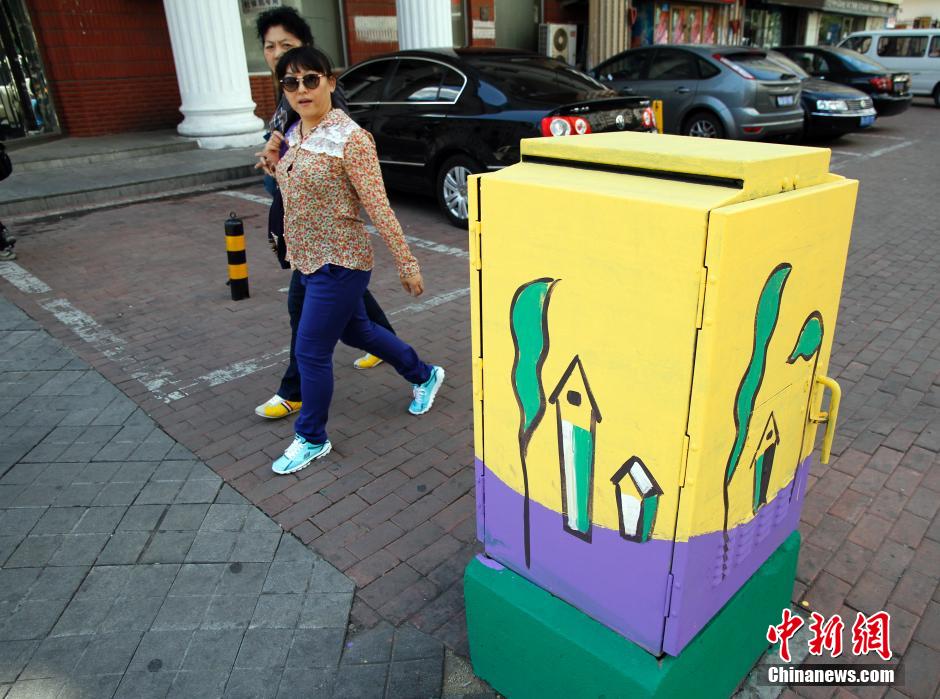 5月27日,哈尔滨市街头的电闸箱上绘上了防水彩色涂料,穿上了“彩衣”的电闸箱成为哈尔滨街头一道亮丽的风景线。中新社发 胡迪 摄
