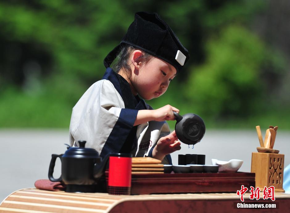 5月27日,小朋友穿着汉服在演示茶道。当日,在沈阳关东影视城上演了一场儿童端午国学读书会。据了解,在六一、端午节期间,这里还将进行祭屈原和传统民俗展示。中新社发 于海洋 摄