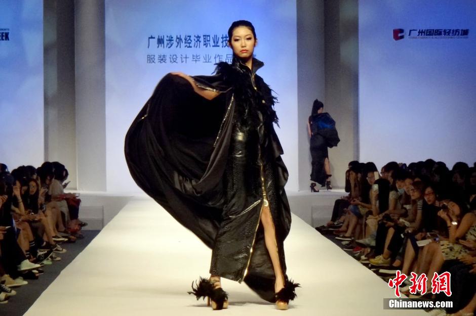 5月27日,2014中国(广东)大学生时装周系列活动之广州涉外经济职业技术学院服装设计毕业作品展演在广州国际轻纺城举行。图为模特现场展示设计师的毕业作品。中新社发 刘卫勇 摄