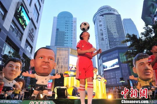 图为“足球巨星汇”开启仪式上一小孩用头顶球。 陈超 摄
