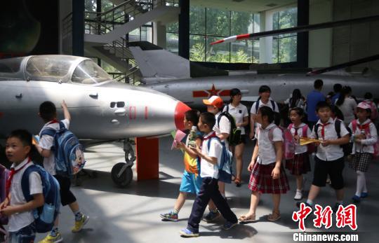 5月28日,小学生们在被展出的各型号的飞机吸引。当日,参加“放飞梦想·快乐启航”活动的南京百家湖小学的小学生们走进南京航空航天大学,在大学生志愿者们的带领下参观航空航天馆、观看航模飞行表演、放飞彩色纸飞机,学习航空知识,感受神奇的航空航天技术。