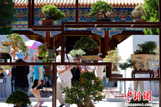 图为北海公园阐福寺内的《岭南盆景名家精品展》。中新社发 富田 摄