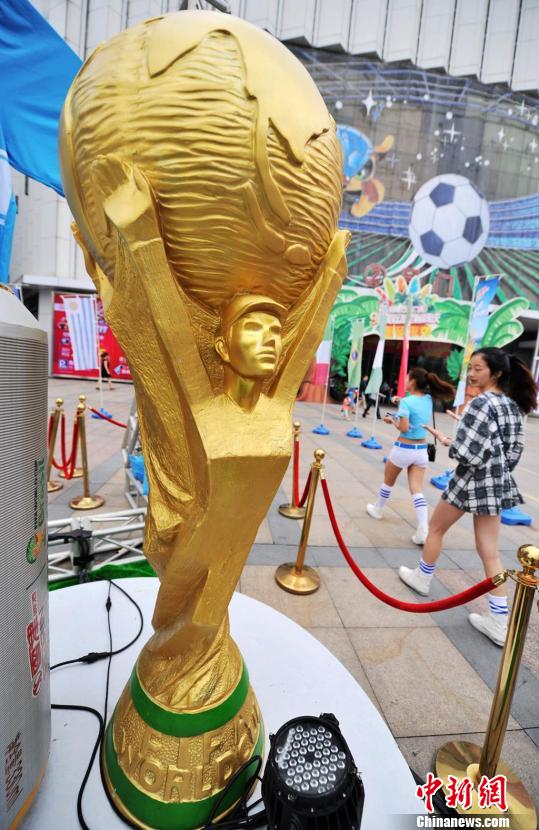 5月31日,一座按照足球世界杯冠军杯为模型打造的超组巨型“大力神杯”亮相福州街头。随着2014巴西世界杯邻近,许多中国商家开始借助世界杯进行各种创意以吸引顾客眼球。 张斌 摄