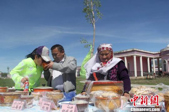 6月1日,那拉提草原举行了哈萨克民族美食展,马奶、塔尔米、包尔萨克等哈萨克风味美食令疆内外游客大饱口福。图为当地游客喝马奶。 朱景朝 摄
