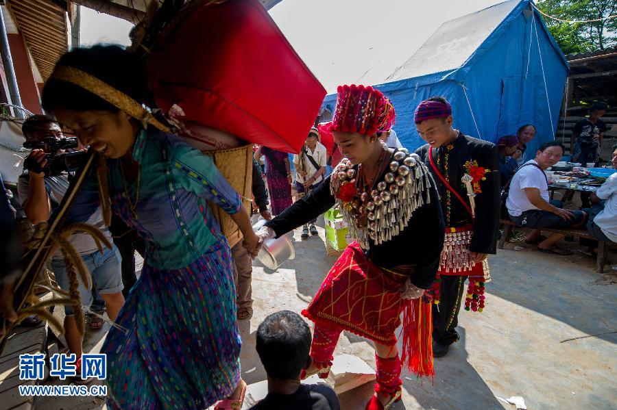 按照当地风俗,新娘保相(中)踩着梯子进门(6月1日摄)。