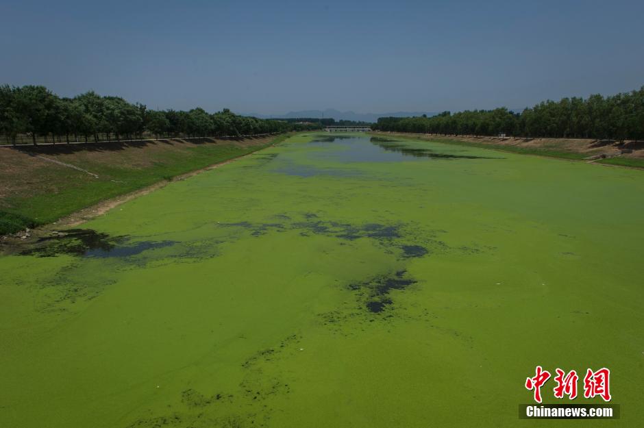 6月3日,大量绿色浮萍聚集在北京温榆河小汤山段河面上,使整个河面如同“草原”一般。据了解,浮萍是一种常见的水面浮生植物,而该种植物的大面积泛滥,一般也被认定为是相关水体中磷元素过量以及水体富营养化的最直观表现。据附近民众反映,该片河道浮萍的暴涨或与河道两边村镇、小区的生活污水直排河道有关。中新社发 崔楠 摄