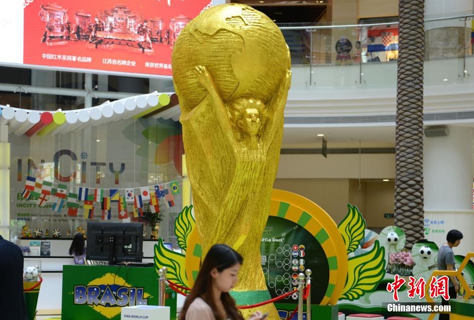 6月3日,巴西世界杯开赛前夕,一组“世界杯”主题艺术陈列品亮相苏州印象城,其中包括5米高的“大力神杯”、各届世界杯比赛用球静态展示和体感射门游戏、桌面足球等互动游戏,众多市民置身其中,提前感受狂热的“世界杯”气息。王思哲 摄