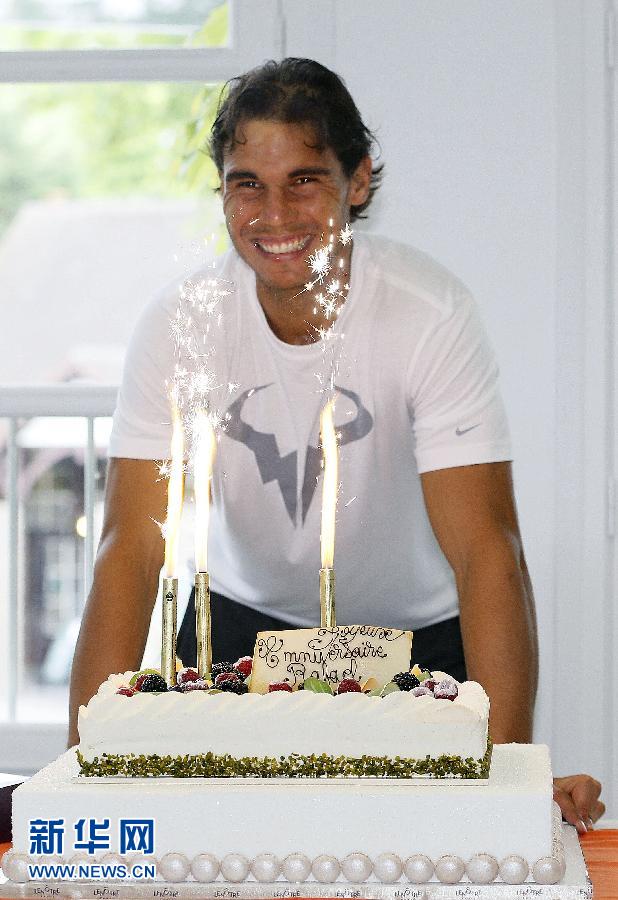 6月3日,纳达尔与生日蛋糕合影。当日,正在征战2014年法国网球公开赛的西班牙选手纳达尔在罗兰·加洛斯体育场度过了自己28岁的生日。新华社/法新