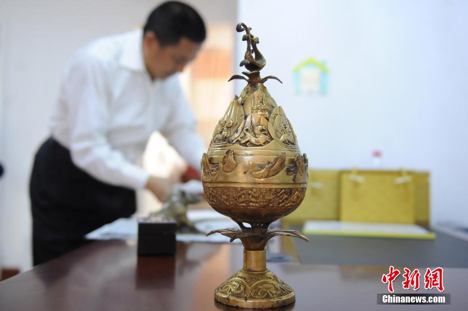 6月4日,兰州民间交流展上展出的西汉鎏金博山炉。该藏品由兰州民间臧家汪先生收藏,该炉高26厘米,足径9.7厘米,器型似豆形,盖肖博山,通体鎏金。座把呈盛开的莲花,顶托炉盘。炉盘四周24个形神兼备的人物,惟妙惟肖的勾勒出西汉丰富多彩的宫廷生活,在人物的下端,围绕炉盘铭刻有17个铭文:中山内铜氏已酉府丙容X斗重卅斤九造。炉盖铸出峻峭起伏的山峦,山间神兽出没、龙腾虎跃,人兽俱欢,小鸟闪翅啼鸣,一幅幅人与自然和谐相处的动人画面。近日,兰州藏家汪先生的西汉鎏金博山炉赴京接受了海峡两岸6位专家的认定并出具了鉴定证书。中新社发 杨艳敏 摄