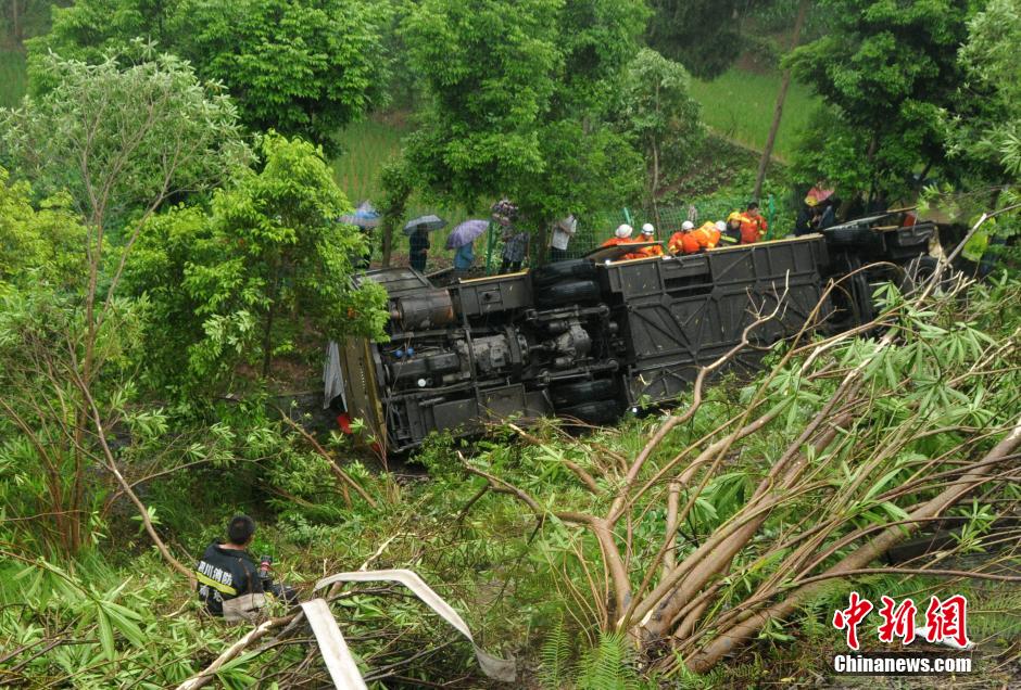 6月4日,事故救援现场。当日下午,沪蓉高速四川南充境内,一辆由广安开往德阳的大客车冲出高速路并侧翻,致车上乘客1人死亡,15人不同程度受伤。目前,伤者正在当地医院救治,涉事客车司机已被警方采取强制措施,事故具体原因高速交警正在调查中。中新社发 钟欣 摄