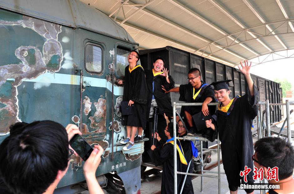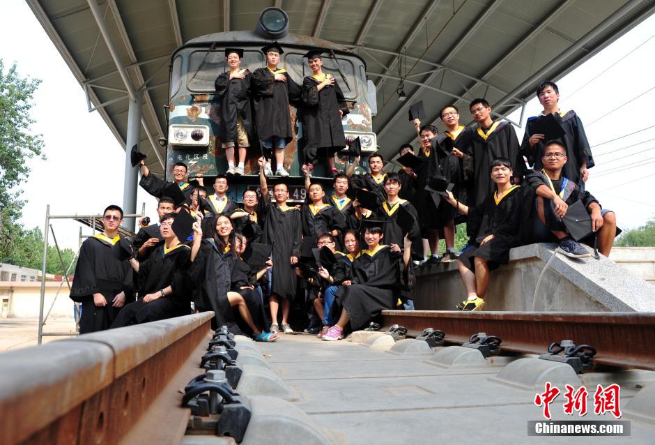 6月5日,石家庄铁道大学毕业班的同学们,正开心地和中国早期的内燃机火车合影,用相机记录下与火车非同寻常的情缘。此时正值每年一度的中国大学生毕业季,很多毕业生选择用照片来定格这段难忘的回忆,制成专属于自己的青春纪念册。中新社发 翟羽佳 摄
