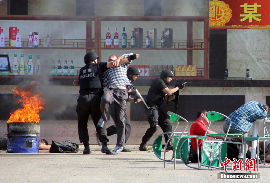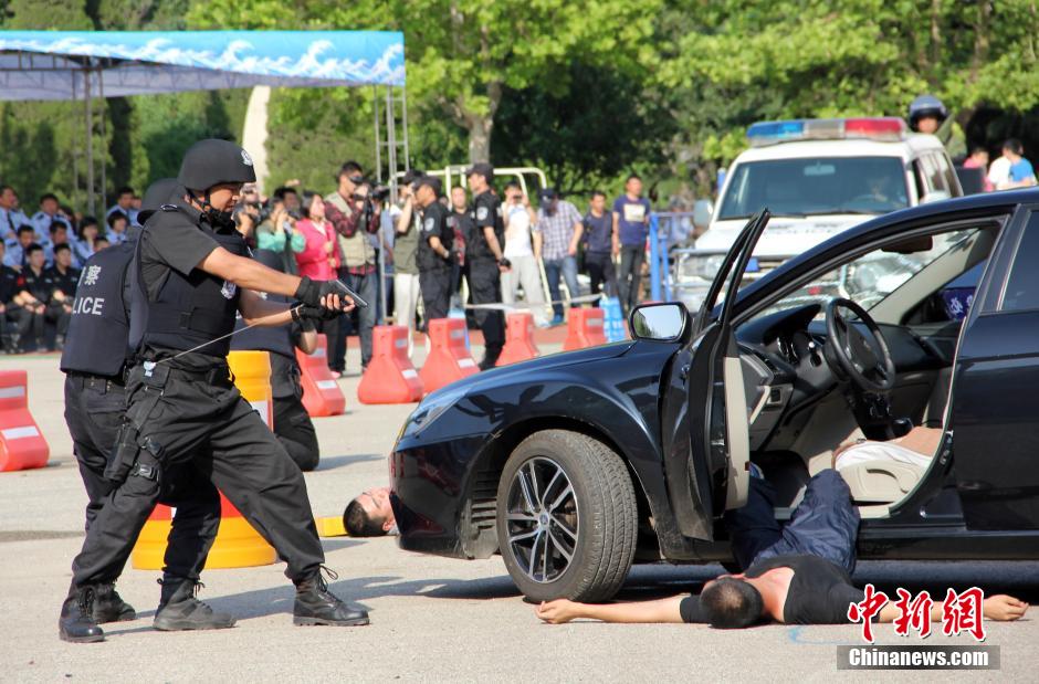 6月5日,烟台警方举行反恐应急处突演练。演练模拟城市酒店、学校附近发生爆炸、砍杀、劫持人质等场景。烟台特警、武警、消防、交管、医疗、电力等多部门联合处置,完成了现场封控、抓捕、搜排爆、堵截查控、调查、勘查等科目演练。王娇妮 摄
