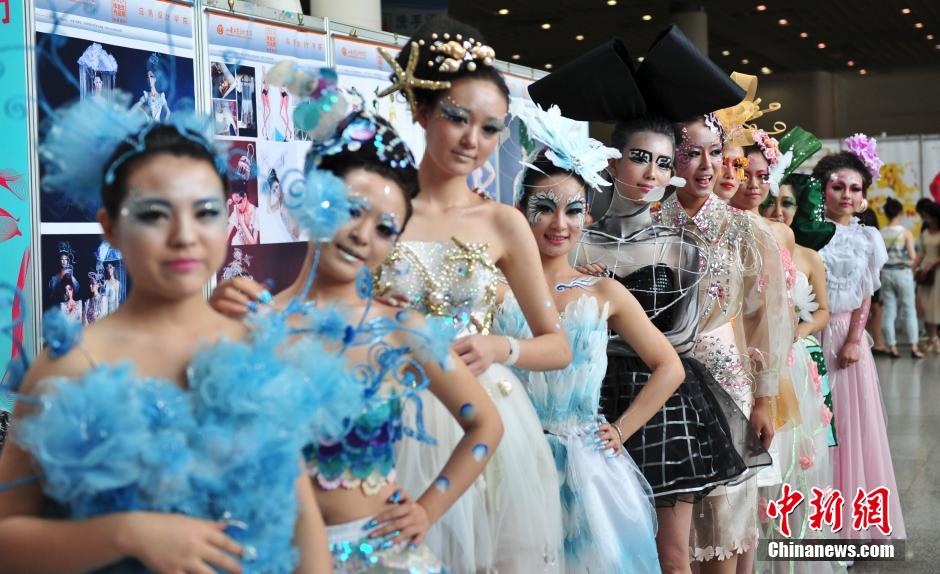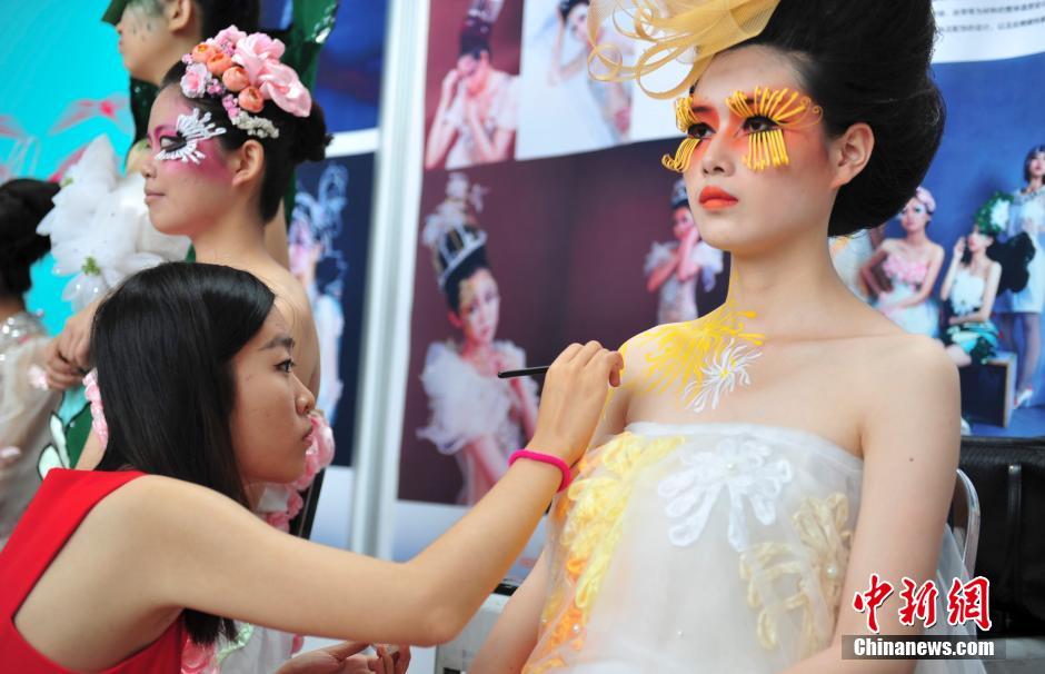 6月5日,大学生现场为模特化妆造型。当日,“山东工艺美术学院2014年设计艺术博览会暨毕业生就业推介会”在济南开幕,吸引许多民众到场观赏。中新社发 张勇 摄
