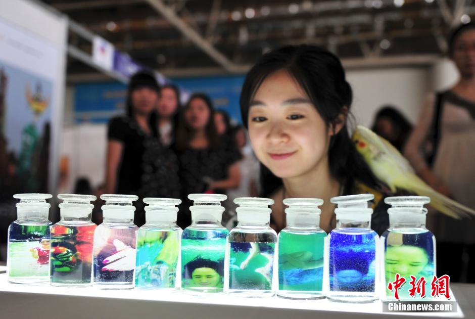 6月5日,水瓶内装的照片吸引参观者。当日,“山东工艺美术学院2014年设计艺术博览会暨毕业生就业推介会”在济南开幕,吸引许多民众到场观赏。中新社发 张勇 摄