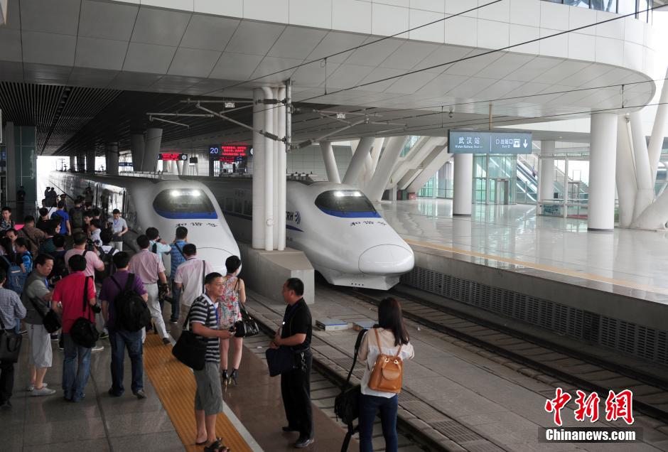 6月5日,C5503次动车进行了载客试运行,从武汉站出发,到大冶北和黄冈东全程直达时间分别为34分钟和31分钟,实现了四地同城“半小时城市圈”。武汉城际铁路目前是指武汉至咸宁、武汉至黄石、武汉至孝感、武汉至黄冈的四条城际铁路。据悉,武汉至黄石、武汉至黄冈两条城际铁路6月上中旬即将开通运营。图为武汉至黄冈城铁试运行列车停靠在黄冈东站。中新社发 张畅 摄