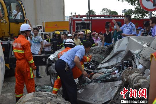 6月8日,福州市江滨路魁岐家园林浦水处发生一起交通事故。福州马尾区消防大队接到报警后,迅速出动1部抢险救援车、7名消防官兵赶赴现场进行处置。事故现场,一辆白色的水泥槽罐车侧翻后将一辆行驶在其左侧的小轿车几乎全部压扁,水泥槽罐车的油箱也已破裂。由于遭受重压,小轿车中一名男童已失去生命迹象,另一中男子也受伤较重被送往医院救治。据了解,水泥罐车司机已被警方控制,事故原因正在进一步调查当中。中新社发 刘万林 摄