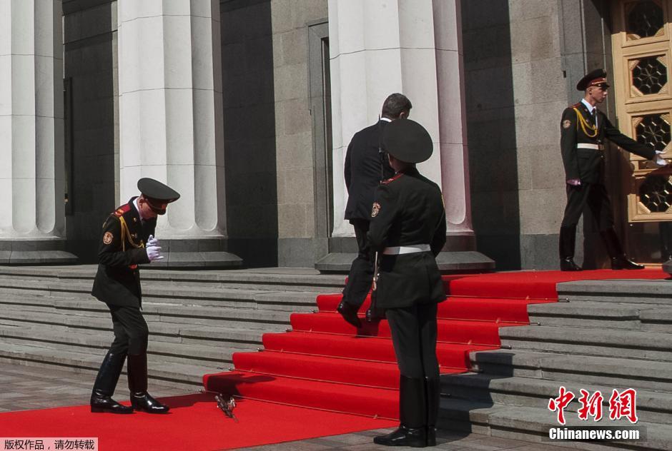 当地时间6月7日,乌克兰基辅,乌克兰新总统波罗申科抵达参加就职仪式会场前发生了小插曲,一名仪仗队士兵的枪支滑落。