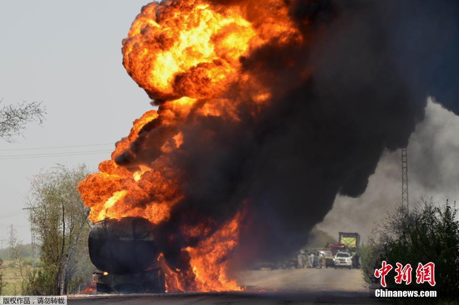 当地时间2014年6月8日,巴基斯坦俾路支省,一辆为驻阿富汗北约军队运送燃料的油罐车遭枪手袭击起火。