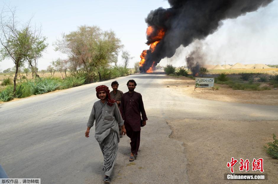 当地时间2014年6月8日,巴基斯坦俾路支省,一辆为驻阿富汗北约军队运送燃料的油罐车遭枪手袭击起火。