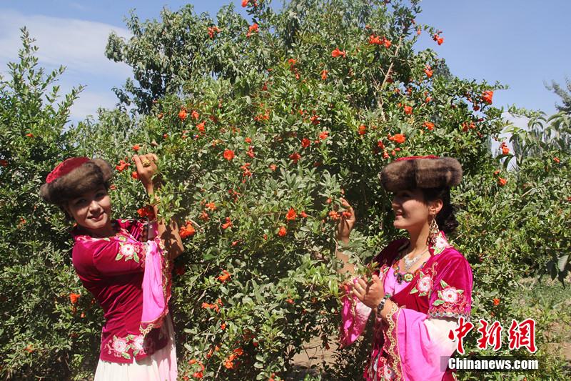 6月9日,正当石榴花开的季节,石榴之乡新疆叶城第八届石榴花节在伯西热克乡石榴风情园开幕。开幕式上当地文工团和普通群众表演了盛大的叶城赛乃姆。当日,来自四邻八乡的群众观看了开幕式表演,并在石榴园内徜徉。图为当地群众盛装游园。朱景朝 摄