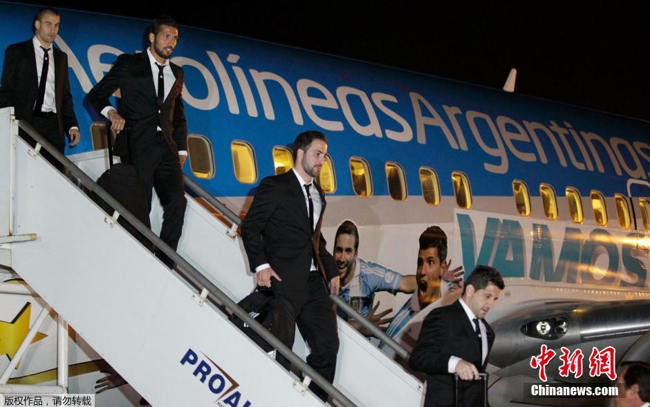 2014年6月9日,巴西科芬斯,2014巴西世界杯前瞻,阿根廷队乘专机抵达科芬斯,梅西西装革履受关注。