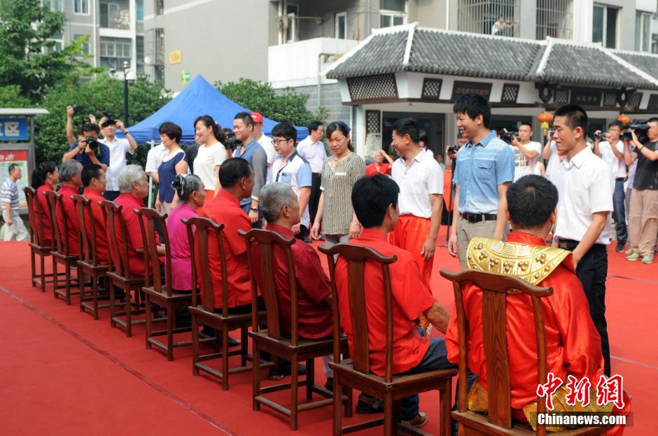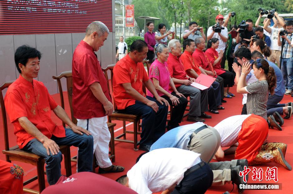 6月11日,第九个“文化遗产日”即将来临之际,湖北的国家级、省级非物质文化遗产项目传承人收徒仪式在武汉汉阳江欣苑社区举行。江汉平原皮影戏、武汉高龙、武汉木雕船模、武汉花灯、铅锡刻镂、楚式漆器、黄梅挑花、红安大布、石花奎面等九个国家级、省级非物质文化遗产项目传承人上台就坐,9名“大师兄”、“大师姐”代表39名徒弟随后上台,学徒张秦依照古礼,代表众学生现场宣读拜师帖,愿执弟子之礼,谨遵师训,团结同道,刻苦钻研,传承非遗技艺,弘扬民族文化。图为非遗传承园收徒拜师仪式现场。中新社发 朱林飞 摄