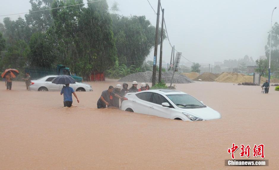 6月11日,广西钦州消防救援人员将被困小汽车推出洪水。当天,强降雨袭击广西沿海,造成钦州、北海市区多处内涝,交通受阻。其中,钦州市多人因积水被困,消防员一个上午即救出40余人。中新社发 罗观宝 摄