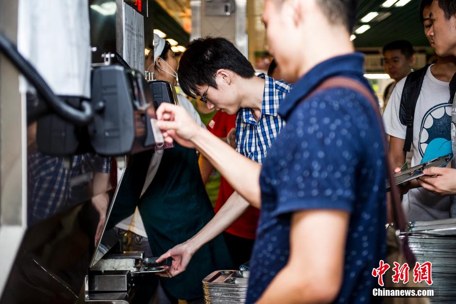 6月11日,广州华南理工大学一食堂内,学生们正在使用新安装的自动打饭机打饭。近日,华工饭堂新购置的两台自动打饭机投入使用。学生只需按照指示放入托盘并刷卡,机器即可自动按量出饭。中新社发 龙宇阳 摄