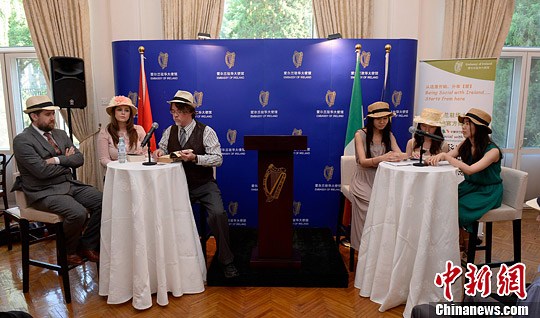 6月11日,爱尔兰驻华使馆举办青年开放日活动,邀请中国青年参观使馆、参加交流活动。两国青年分别用各自国家的语言朗诵了爱尔兰文学作家詹姆斯·乔伊斯于1922年出版的长篇小说《尤利西斯》。中新社发 侯宇 摄