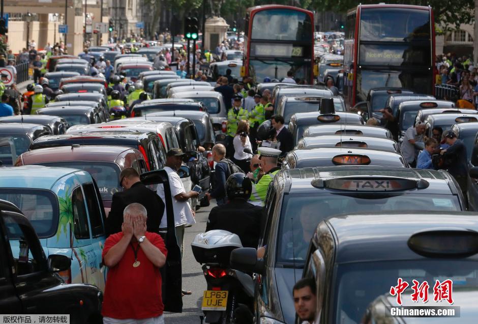 当地时间2014年6月11日,英国伦敦,出租车司机进行了为期24小时的示威,抗议无运营牌照的“黑车”,特别是美国打车应用Uber,该应用方便人们相互联系以共用同一辆车或者支付少量费用给私家车进行市内的短途出行。