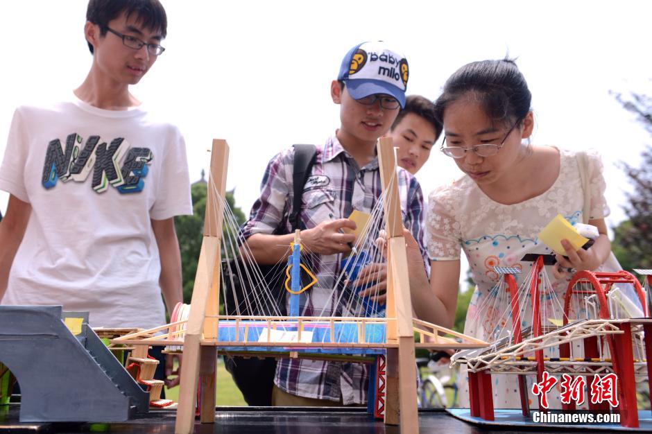 6月11日,参加苏州大学第八届桥模设计大赛的作品在该校校园内进行展出,吸引了众多师生前来参观投票。据了解,此次比赛为2014年苏州大学“奋斗的青春最美丽” 系列活动之一,参赛的作品均由木制品、竹制品以及废旧材料等制作而成,旨在培养大学生的动手能力和创新意识,为他们提供一个展示的平台。中新社发 王思哲 摄