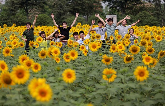 6月12日,大学生在成片的向日葵丛中拍摄照片。眼下正是向日葵开花的季节,在南京信息职业技术学院校园内,占地60亩的数万株向日葵花竞相开放,放眼望去场面壮观。中新社发 泱波 摄